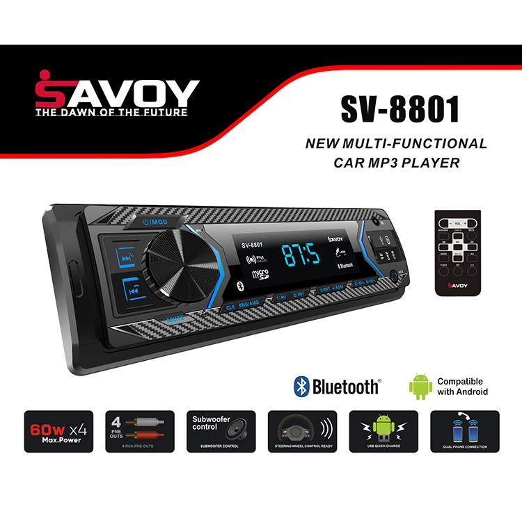 دکلس پنل ثابت ساووی SV-8801 دارای قابلیت ها و ویژگی های خوب و کار آمدی می باشد که شامل ، بلوتوث ، ورودی USB ، رادیو ، ورودی AUX و ورودی شارژ موبایل می باشد.
