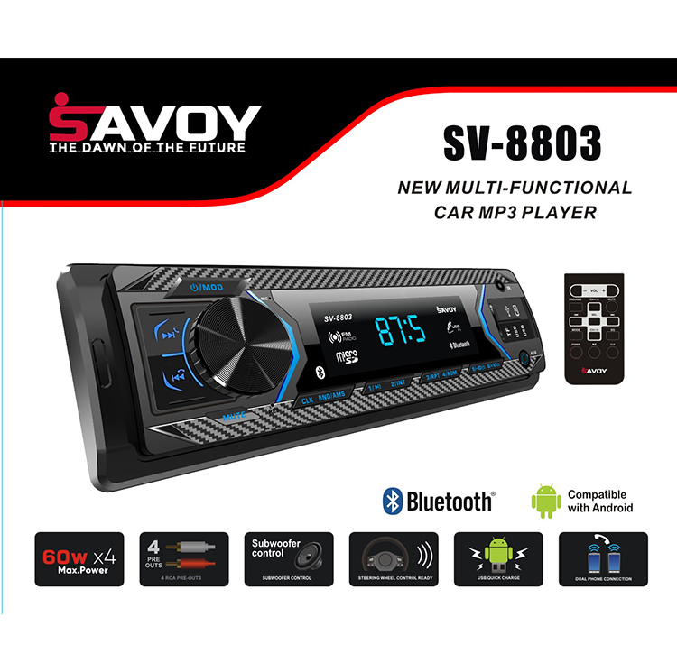 دکلس پنل ثابت ساووی SV-8803 دارای قابلیت ها و ویژگی های خوب و کار آمدی می باشد که شامل ، بلوتوث ، ورودی USB ، رادیو ، ورودی AUX و ورودی شارژ موبایل می باشد.