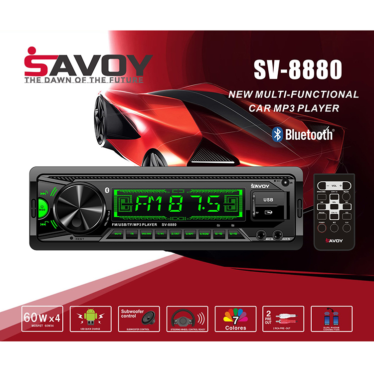 دکلس پنل ثابت ساووی SV-8880 دارای قابلیت ها و ویژگی های خوب و کار آمدی می باشد که شامل ، بلوتوث ، ورودی USB ، رادیو ، ورودی AUX و ورودی شارژ موبایل می باشد.